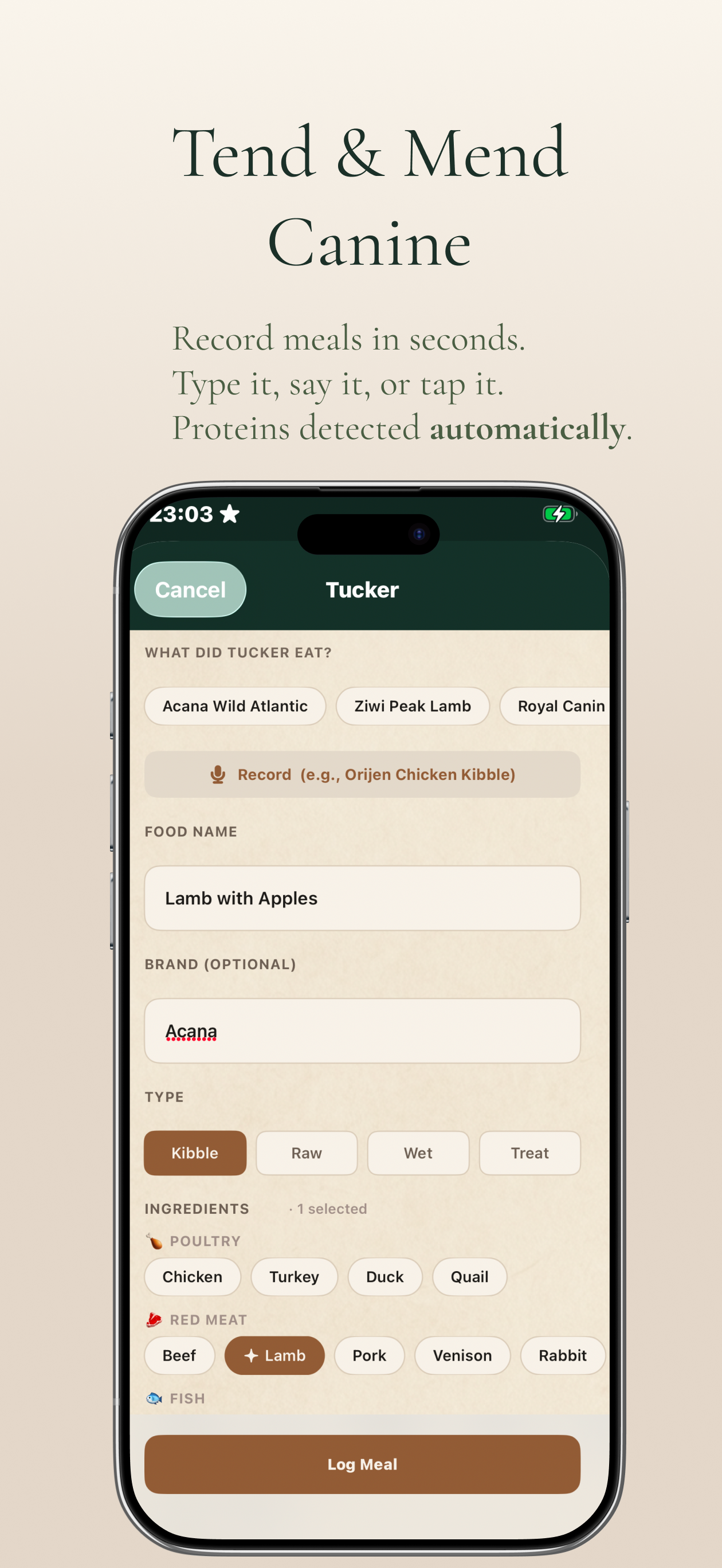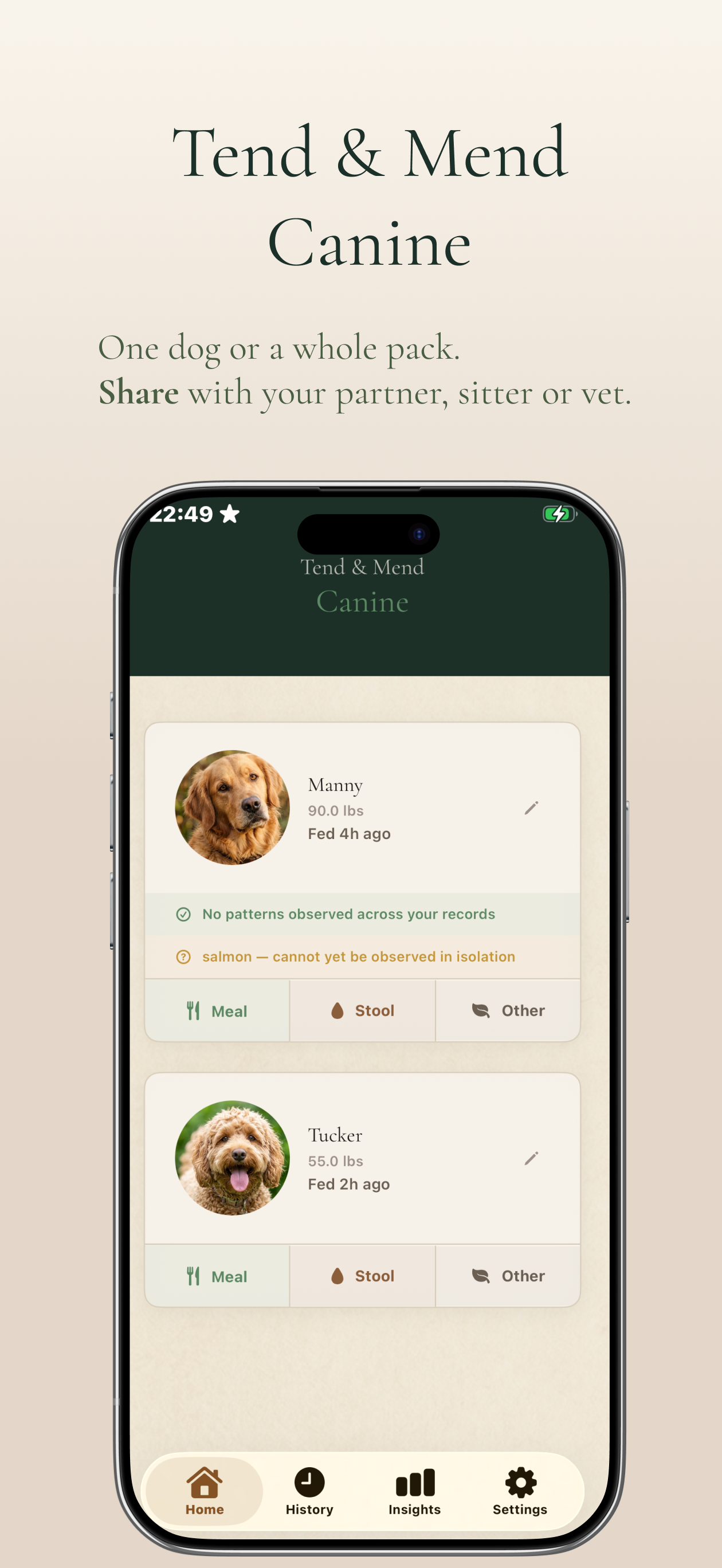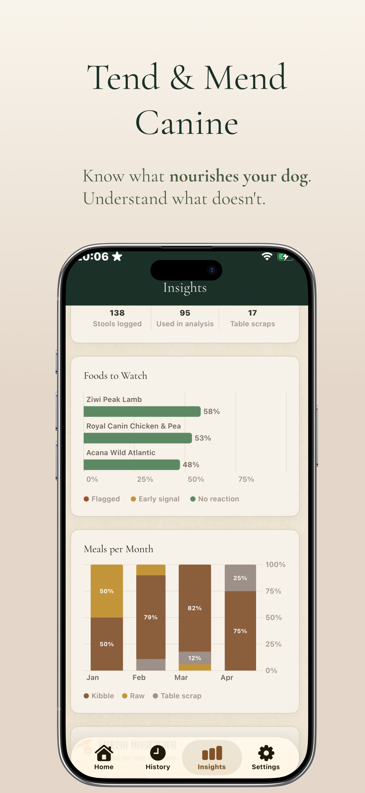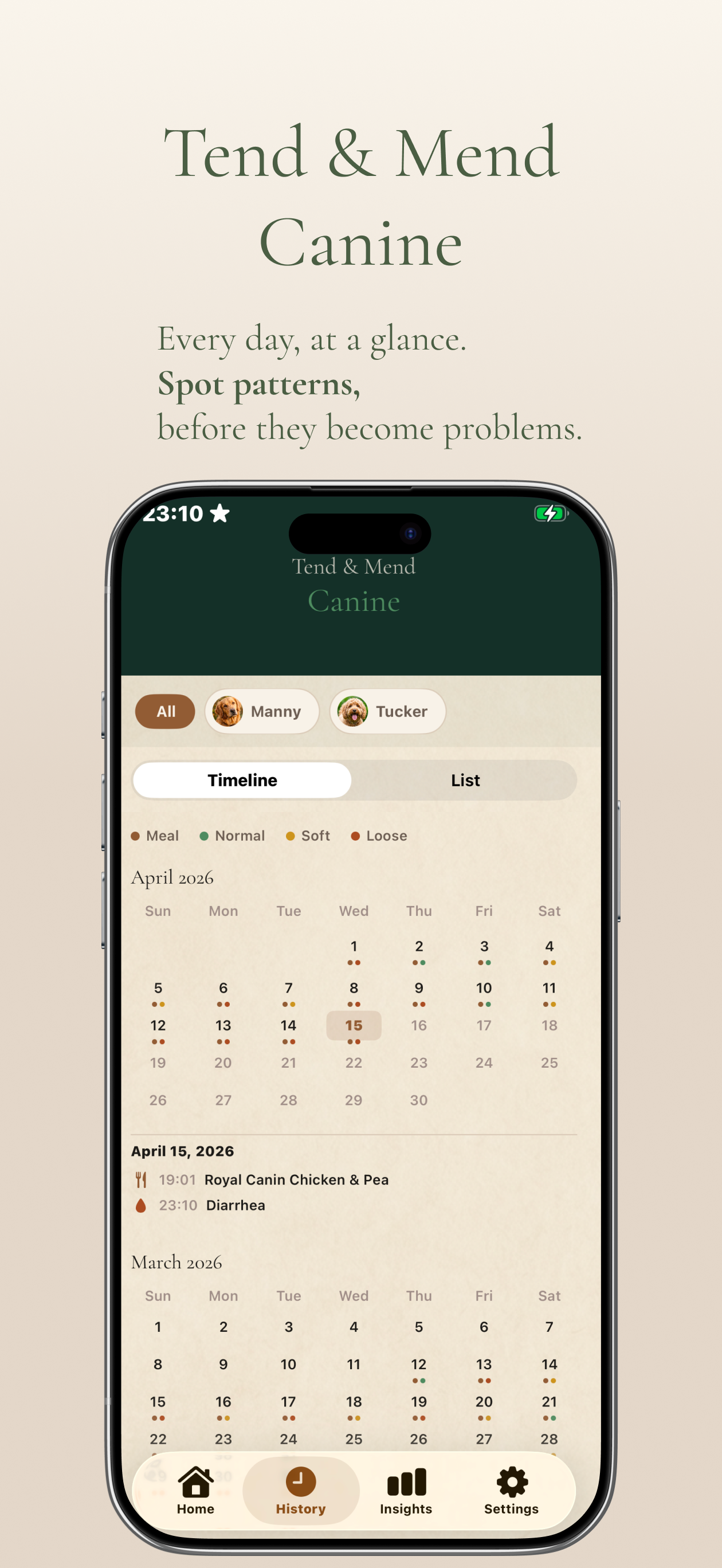 Track your dog's meals and digestive symptoms day by day. Build a longitudinal picture and share vet-ready reports that turn your observations into clinical evidence.