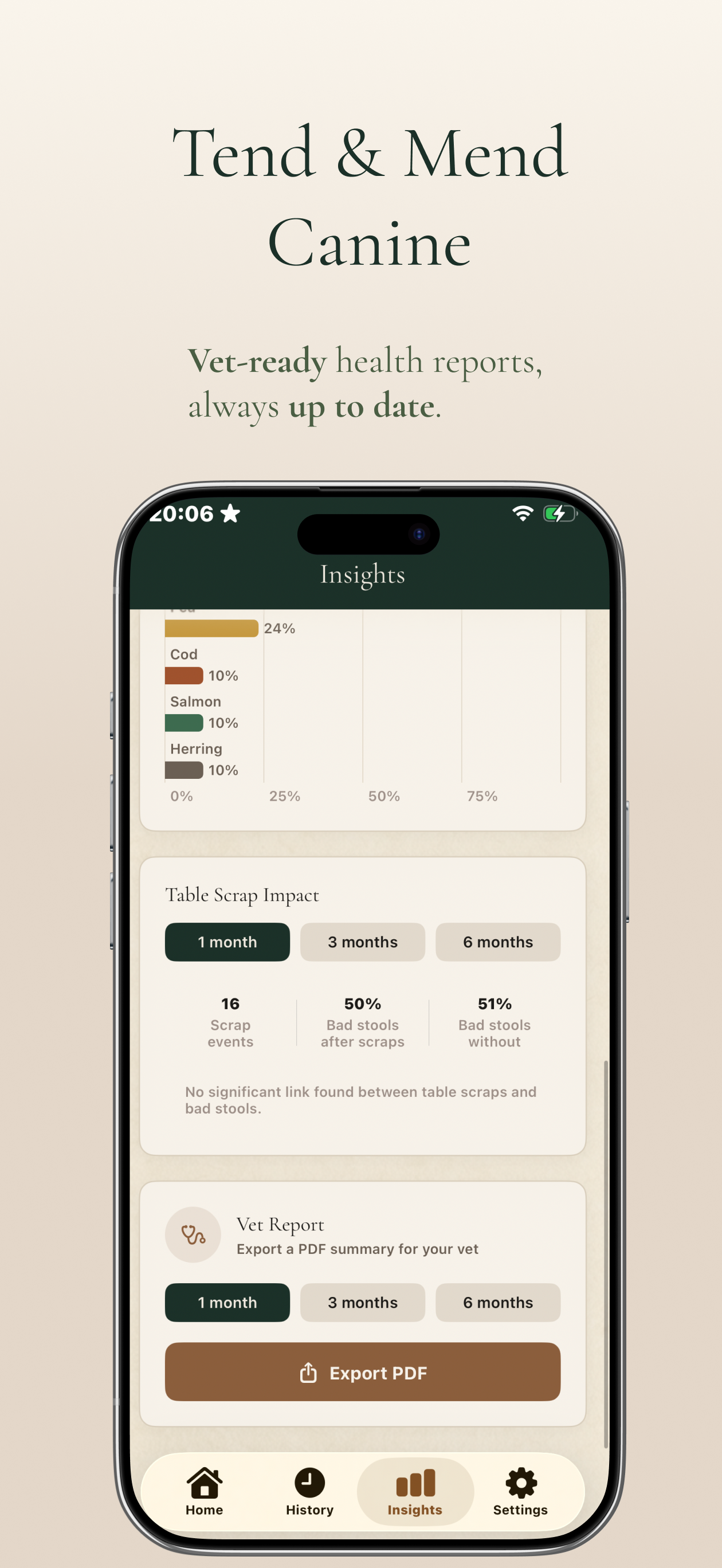Export a structured PDF covering your dog's meal history, symptom frequency, and notable patterns — so your vet has the full picture before the appointment even begins.